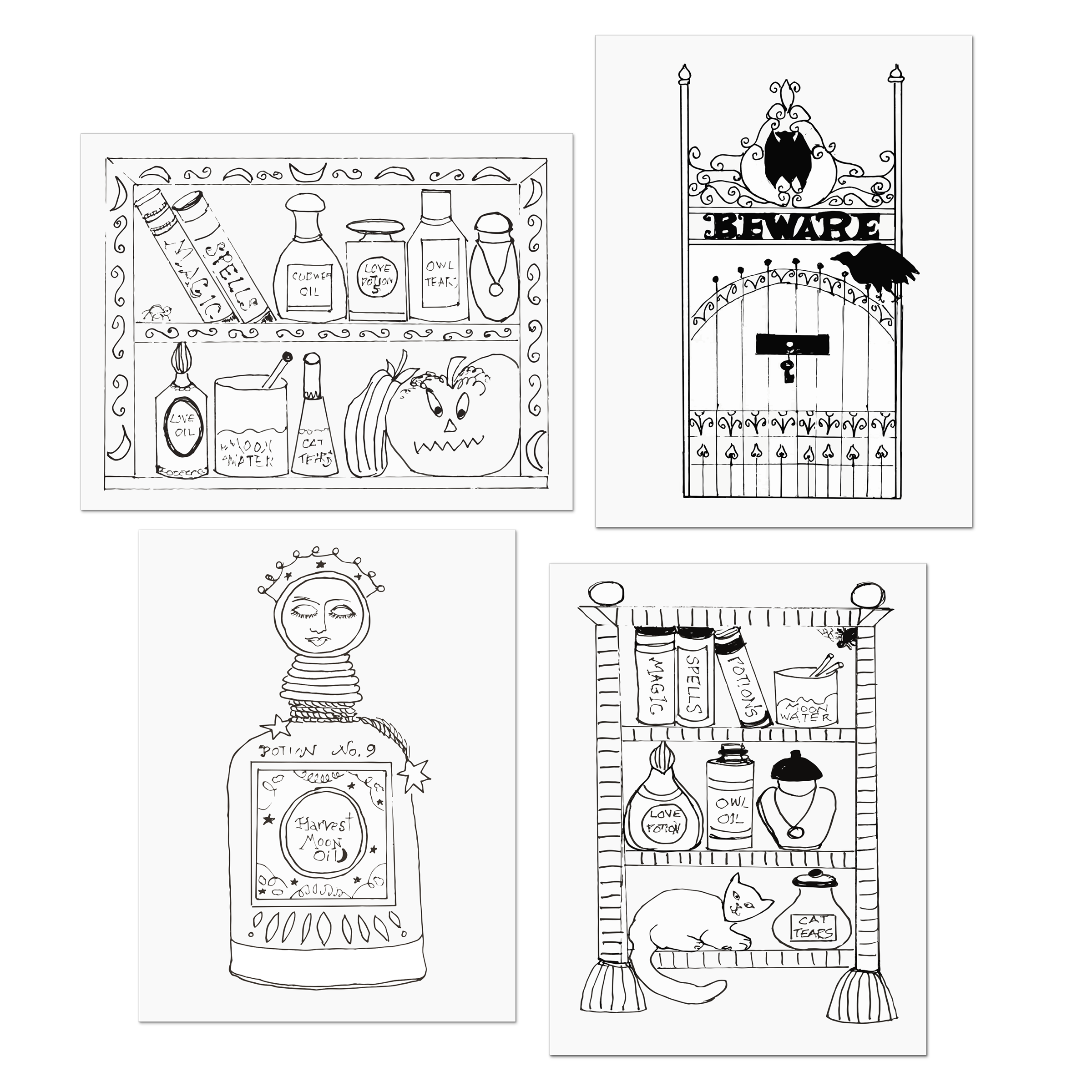 Four perfectly witchy postcards to color in and send just in time for trick-or-treat.